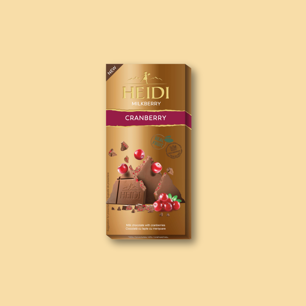 Die HEIDI Milkberry Cranberry kombiniert zarte Milchschokolade mit der angenehm säuerlichen Frische von Cranberries. Der cremige Schmelz der Schokolade harmoniert ideal mit der fruchtigen Note und sorgt für ein ausgewogenes Geschmackserlebnis. Eine ideale Wahl für alle, die klassische Milchschokolade gerne mit einem fruchtigen Akzent genießen.